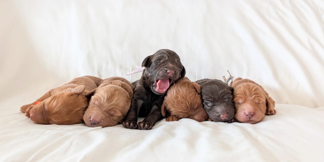 Evie and Dobby welcomed 6 gorgeous puppies in shades of caramel, gold and chocolate on the 21st of November. Evie is a natural and has taken to motherhood like she was born to do it. This litter has been our easiest yet. All puppies are gaining weight every day and Evie is loving every moment of being a mum